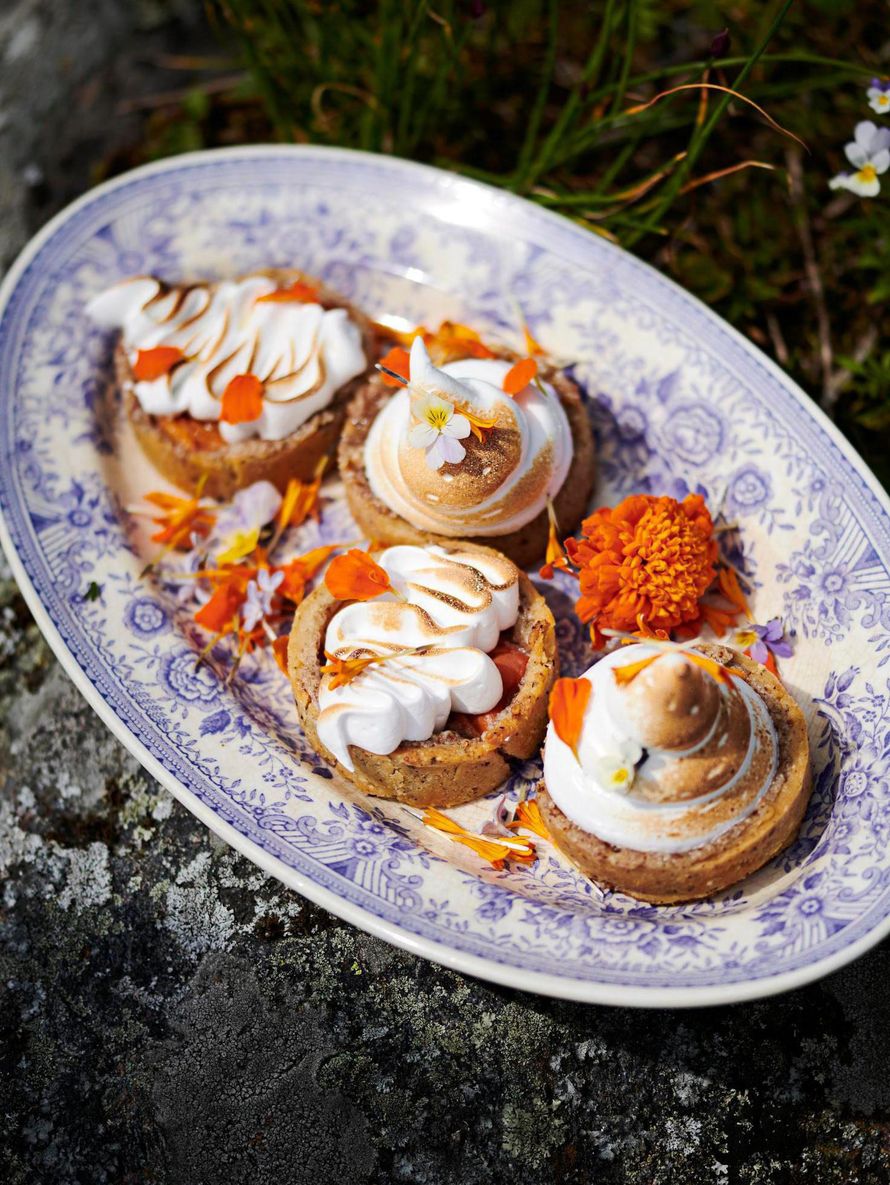 Valmista marenki. Erottele valkuaiset metalliseen kulhoon. Laita vesi ja sokeri kattilaan. Kuumenna vesi-sokeriseos 120-asteiseksi ja vaahdota valkuaiset kovaksi vaahdoksi. Kaada vesi-sokeriseos ohuena nauhana valkuaisiin koko ajan vatkaten. Jatka valkuaisten vatkaamista, kunnes marenki on huoneenlämpöistä. Lusikoi tai pursota marenkia torttujen päälle. Paahda marengin pinta halutessasi tohottimella. Koristele leivokset syötävillä kukilla.