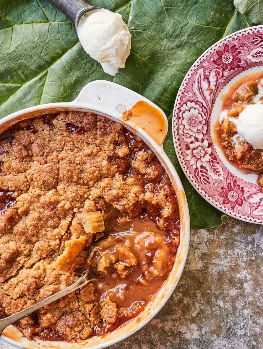 Viiden aineksen raparperipaistos on mökkiherkku parhaimmillaan. Kylmä vaniljajäätelö kruunaa kuuman kesäjälkkärin.