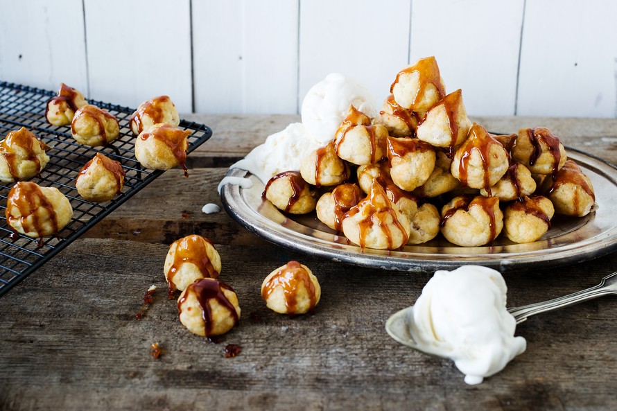 Ihanan kuohkeat tuulihatut täytetään Irish cream -rahkalla ja kuorrutetaan karamellilla. Nämä herkut syödään vaniljajäätelön kera.