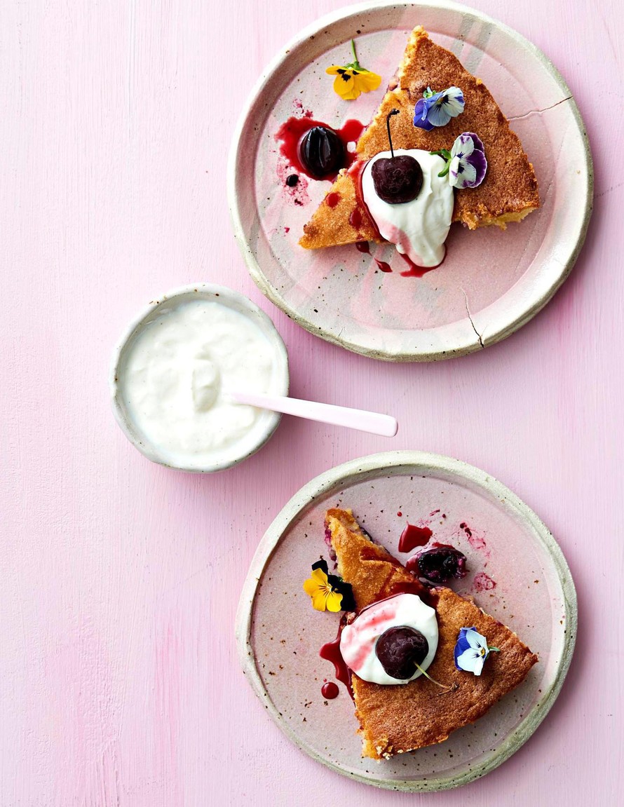 Kirsikka-mantelipiirakka ja vaniljavaahtoa