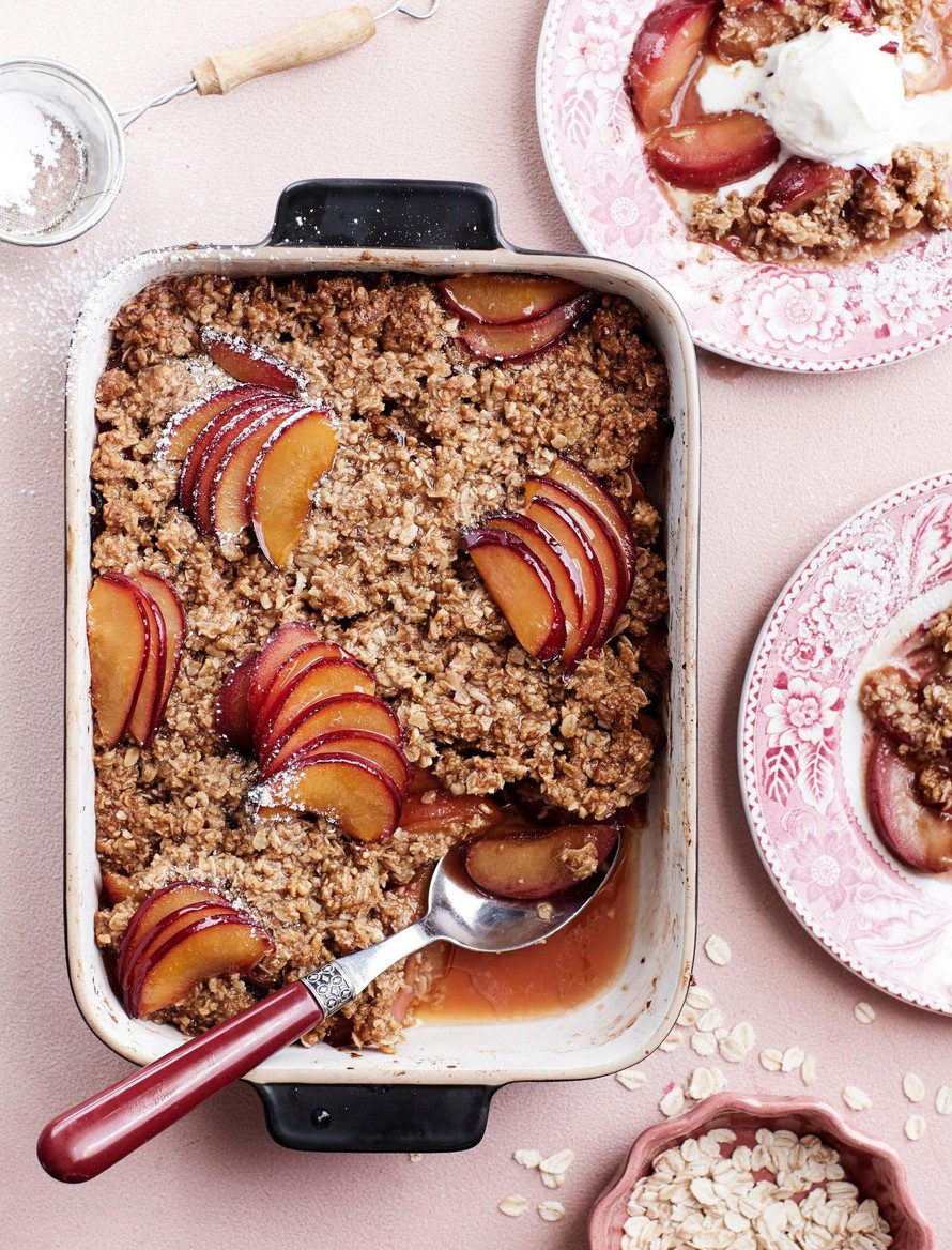 Luumu-kauracrumble yhdistää pehmeän ja rapean koukuttavalla tavalla. Taikinamurujen alle voi luumujen sijaan laittaa hapokkaita omenoita, karviaisia tai muita marjoja tai hedelmiä, jotka pistävät fariinisokerille kampoihin.