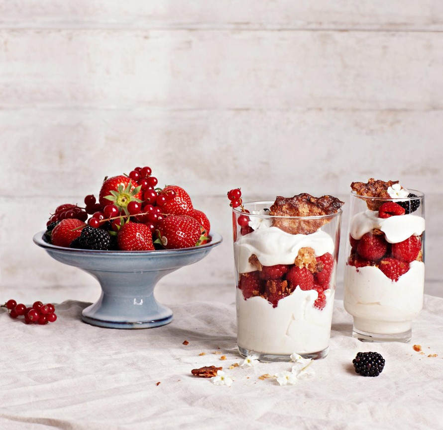 Lusikoi korkeisiin laseihin kerroksiksi kermarahkaa, marjoa ja murusteltua kaurakeksiä.