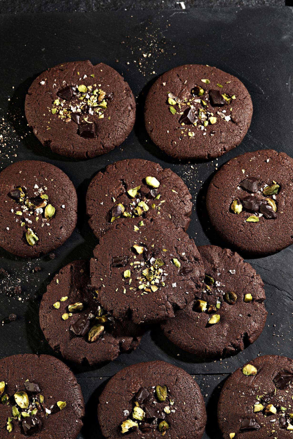 Valmiin keksitaikinan kannattaa antaa rauhassa asettua jääkaapissa, jolloin keksit leviävät paistettaessa tasaisemmin. Suola ja pistaasipähkinät viimeistelevät nämä tumman tuhdit keksit.