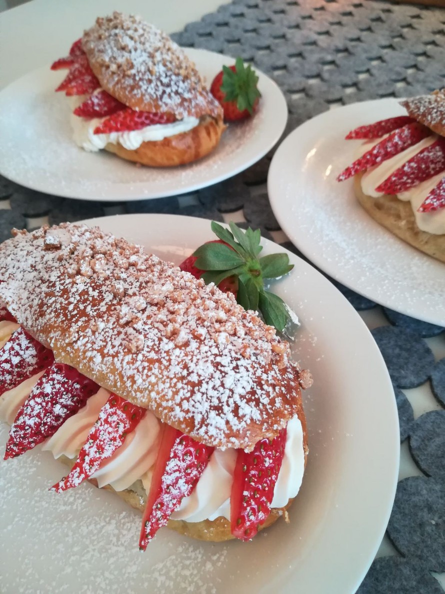 Halkaise jäähtyneet pullat. Täytä ne mansikanviipaleilla sekä kermavaahdolla.