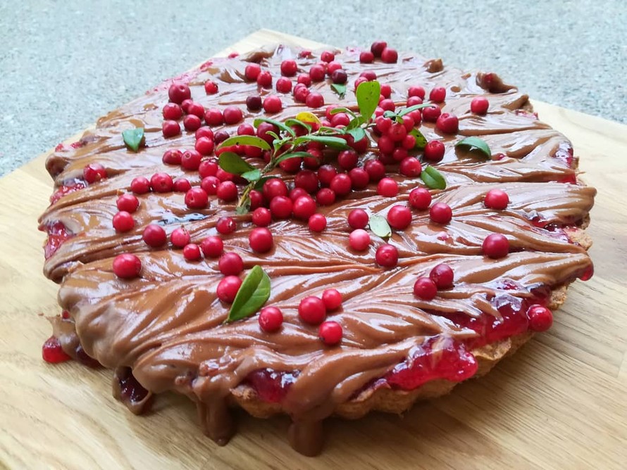 Levitä marmeladi piirakkapohjan päälle. Pursota tai levittele suklaakinuski marmeladin päälle. Koristele pinta puolukoilla.