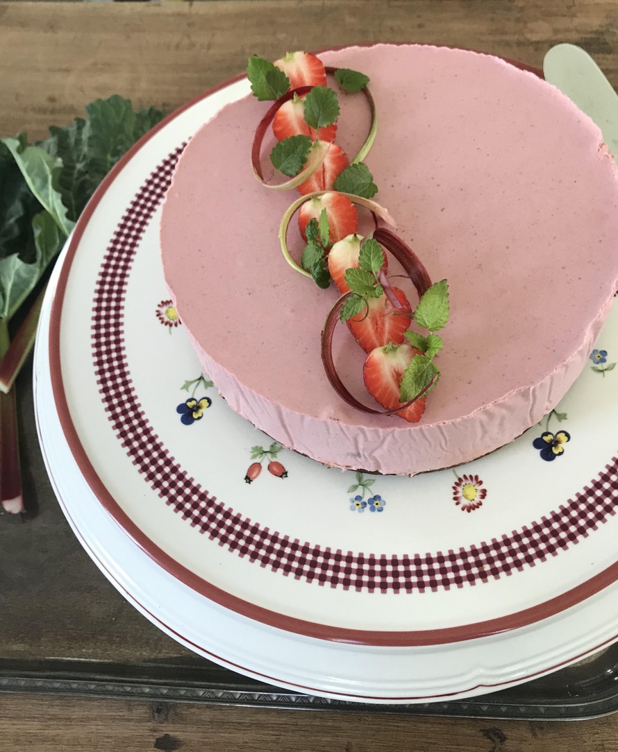 Juhlava mansikkajuustokakku raparperi-toscapohjalla