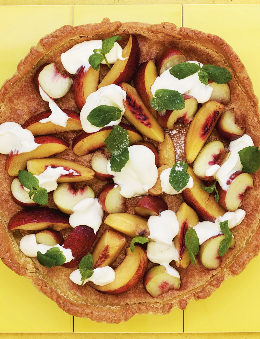 Poista hedelmistä kivet ja leikkaa hedelmät suupaloiksi. Laita palat kulhoon ja mausta tomusokerilla. Mausta ranskankerma vaniljasokerilla. Lusikoi kerma piirakalle ja lisää hedelmät päälle.