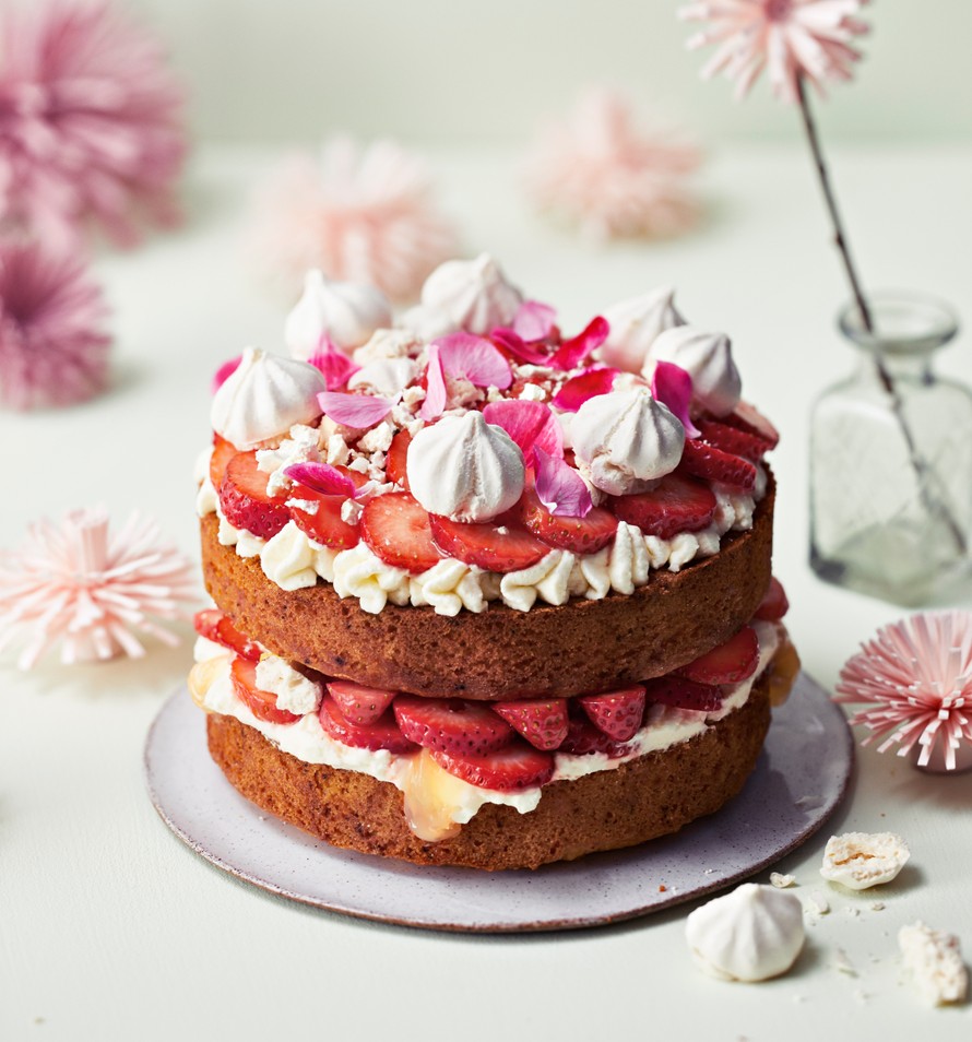 Englantilaisen klassikkojälkiruuan marjat, marengit ja kermavaahto pujahtivat kesäiseen mansikkakakkuun.