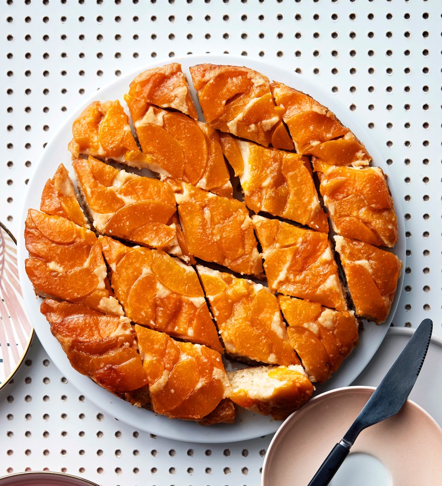Nostalgia huokuvaa säilykepersikoista leivottu keikauskakku saa modernin vireen tujauksesta inkivääriä.