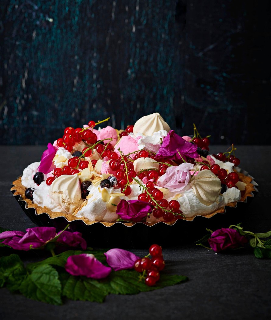 Levitä kermavaahto, marengit ja marjat kerroksittain piiraspohjan päälle. Koristele koko komeus marjoilla ja syötävillä kukilla.