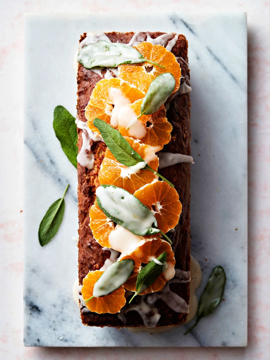 - Kuorruta kakku huoneenlämpöisenä. Kuori ja viipaloi mandariinit. Sekoita tomusokeri ja appelsiinimehu pienessä kulhossa. Valuta 2/3 tomusokerikuorrutuksesta kakun pinnalle, levitä mandariiniviipaleet ja salvianlehtiä kuorrutuksen päälle. Valuta loppu tomusokerikuorrutus pinnalle.