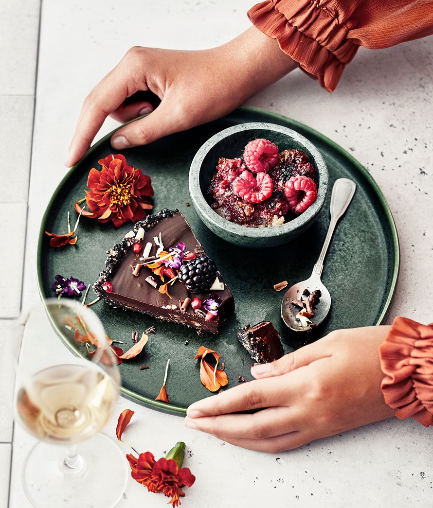 Täyteläisen suklaaganachepiiraan maku saa lämpöä ripauksesta kanelia, kardemummaa ja chiliä. Jo pieni pala riittää tyydyttämään suklaanhimon.