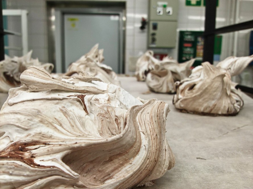 Lämmitä valkuaiset ja sokeri(a.) vesihauteessa +72 astetta ja vaahdota. Kiehauta vesi ja sokeri (b.). Sekoita sokeri (c.) ja kaakaojauhe. Sekoita sokerivesi ja kaakaojauhe-sokeriseos keskenään. Nostele kaakaoseos marenkivaahtoon. Sekoita vain vähän että suklaa jää raidoiksi. Nostele kauhalla läjiä pellille. Anna marenkien olla uunissa 80 asteessa, niin kauan että ne on kuivia.