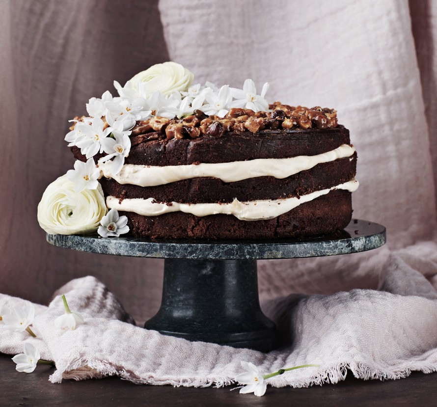 Kondensoitua maitoa ja suolapähkinöitä sisältävä kakku on täydellisen tahmea superherkku.