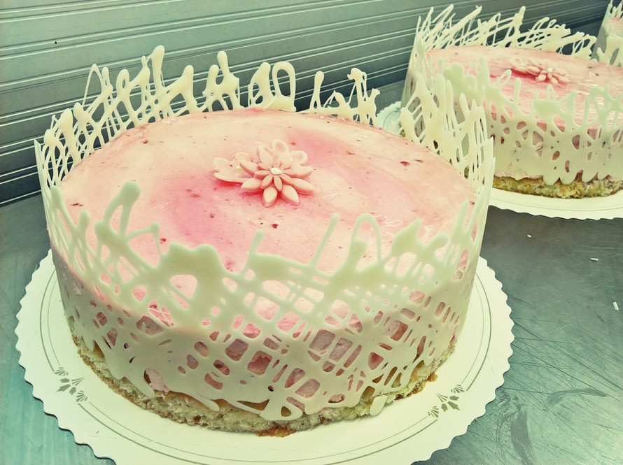 Kaada täyte pohjan päälle, levitä tasaiseksi. Vie hyytymään pakastimeen. Kun kakku on hyytynyt levitä pintaan kiilteen ja elintarvikevärin seos. Irroita kakku vuuasta.