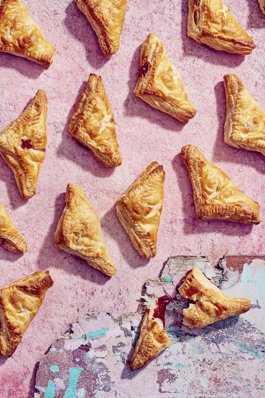 Nopeasti valmistuvien vadelmakolmioiden sisältä löytyy vadelma-tuorejuustotäytettä.