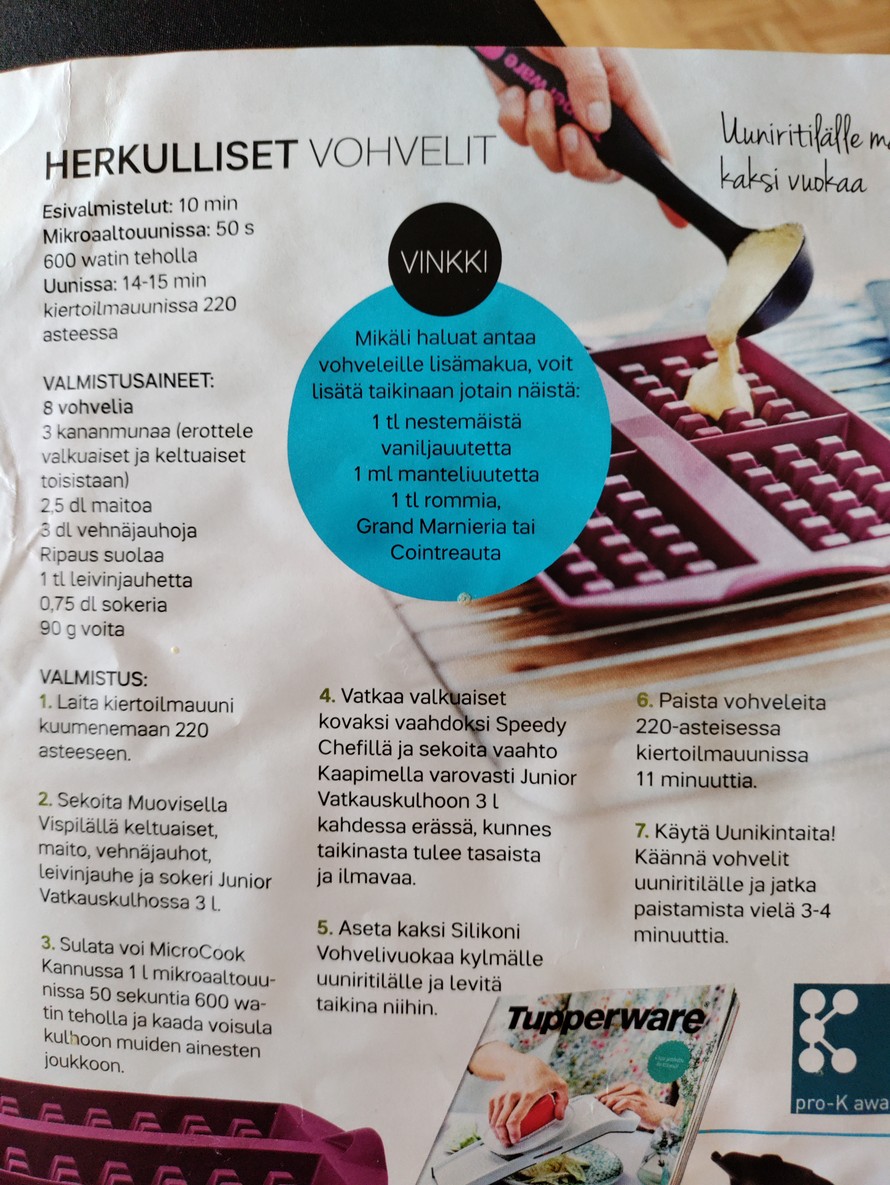 Levitä taikina vohvelivuokiin uuniritilän päälle ja paista 220°C 10 minuuttia. Käännä vohvelit uuni ritilälle ja paista 4 minuuttia.