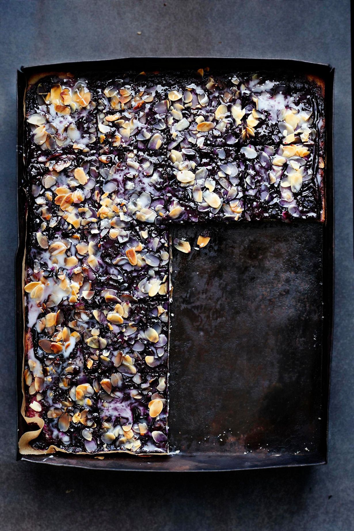 Mehukas vegaaninen mustikkapiirakka muistuttaa rakenteeltaan hieman enemmän pannaria kuin piirakkaa. Täyte on uskomattoman syvän mustikkainen.