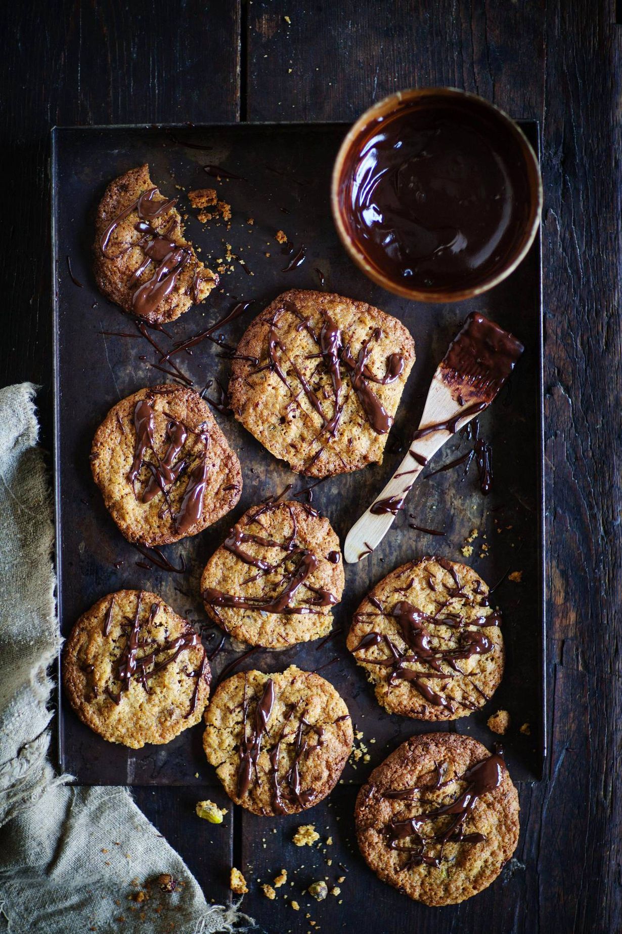 Sulata suklaa mikrossa tai miedolla lämmöllä kattilassa. Valuta keksien päälle suklaata.