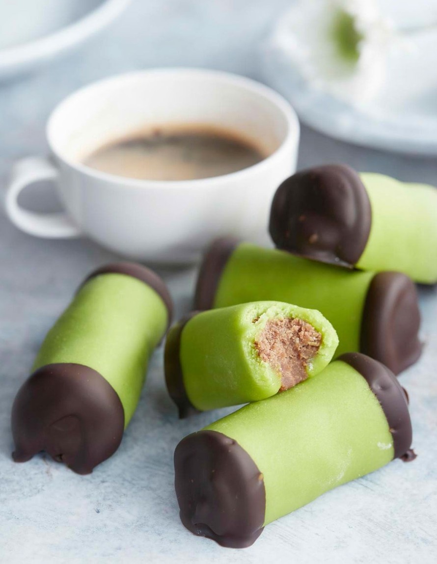 - Kääräise marsipaanineliöt taikinapötköjen ympärille. Nipistä marsipaanin sauma kiinni ja nosta leivokset alustalle saumapuoli alaspäin.