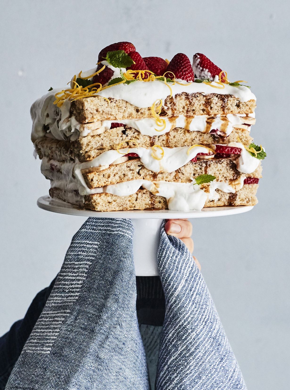 - Kokoa kakku. Leikkaa kakkupohja kolmeen tai neljään osaan. Nosta ensimmäinen kerros tarjoilulautaselle. Levitä päälle kinuski. Levitä banaani- ja mansikkasiivuja. Levitä kermavaahtoa. Nosta toinen kakkupohja päälle ja täytä se samaan tapaan. Lopuksi koristele ylin kerros soijavaahdolla, mansikoilla ja sitruunankuorisuikaleilla.