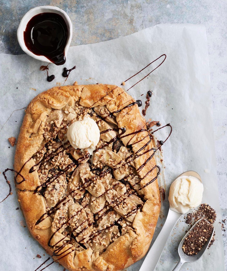Trendikkääseen galetteen on helppo rakastua, koska täytteeksi käyvät monet jääkaapin jämät hilloista tuorejuustonokareisiin. Tällä kertaa rento peltipiiras täytetään pähkinöillä, suklaalla ja banaaniviipaleilla.