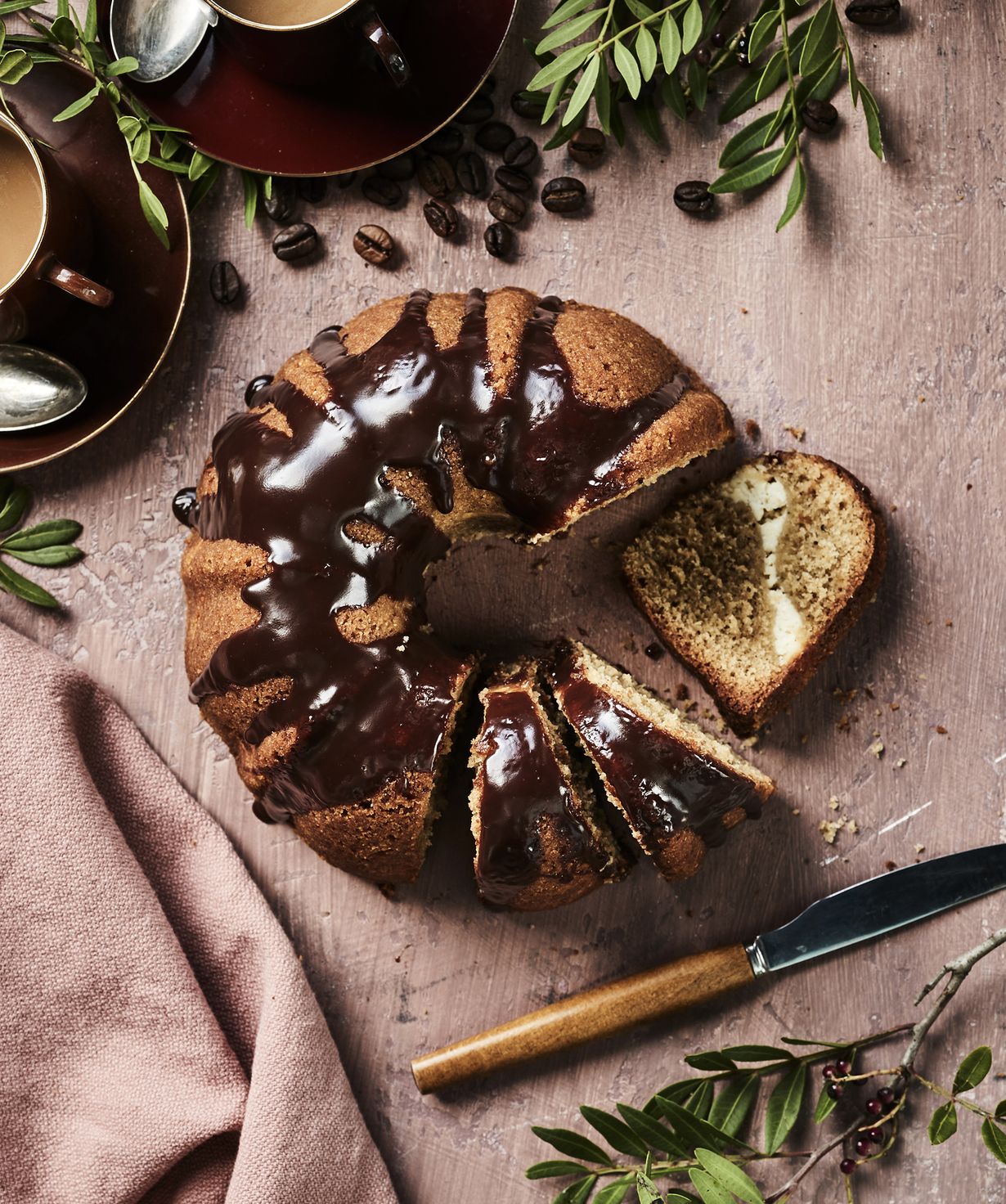 Loppuvuoden ilonpitoon täydellisessä kakussa maistuvat kahvi ja suklaa. Yllätyksenä viipaleesta löytyy raita, joka paljastuu vaniljaiseksi tuorejuustoksi.