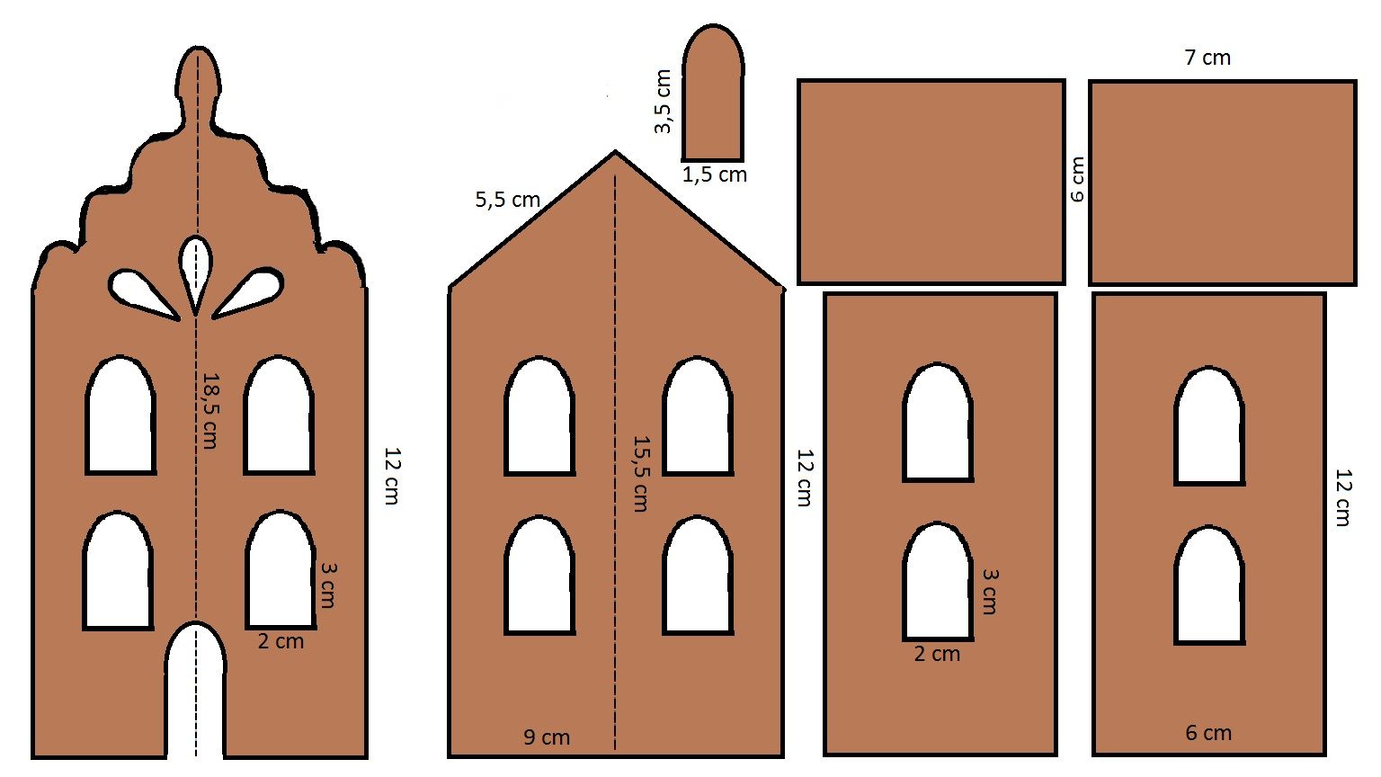 - Kaulitse taikinalevy leivinpaperin päällä 3–4 mm paksuiseksi levyksi. Vedä taikinalevy ja leivinpaperi uuninpellin päälle. Leikkaa talon osat veitsellä kaavojen mukaan ja muista ottaa ovi talteen. Kaulitse lopusta taikinasta talolle aluslevy (halkaisija noin 20 cm). Jätä talon osien väliin tilaa, jotta ne eivät tartu toisiinsa kiinni paistamisen aikana.
