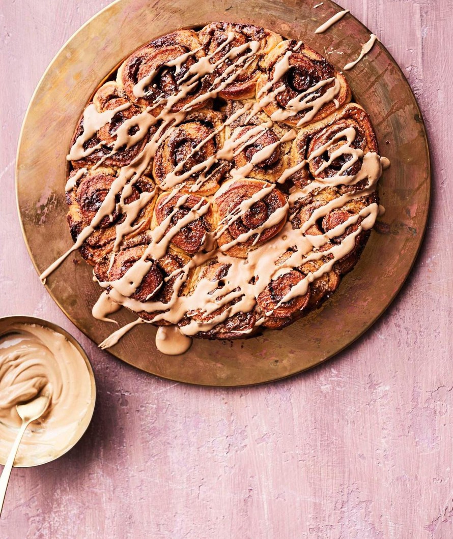 Kauli taikina suorakaiteen muotoiseksi levyksi (25x45 cm). Levitä täyte levylle ja kääri taikina tiukaksi rullaksi. Leikkaa rulla 14 palaan. Laita 10 pullapalaa vuokaan reunoille ja 4 keskelle.