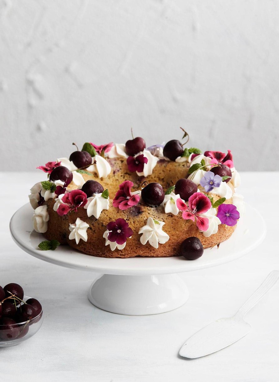 Vatkaa kerma vaahdoksi ja mausta se halutessasi tomusokerilla. Pursota kermasta jäähtyneen kakun pintaan ruusukkeita. Koristele kakku tuoreilla kirsikoilla, syötävillä kukilla ja mintunlehdillä.
