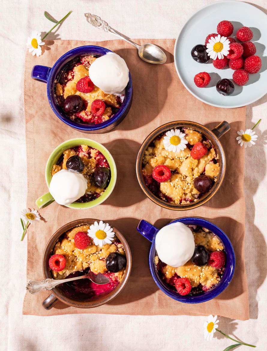 Jaa muruseos kirsikoiden ja vadelmien päälle kuppeihin. Laita kupit uunipellille ja nosta pelti uunin alatasolle. Paista 20–25 minuuttia, kunnes paistokset ovat saaneet kauniin värin. Tarjoa lämpiminä vaniljajäätelön kanssa.