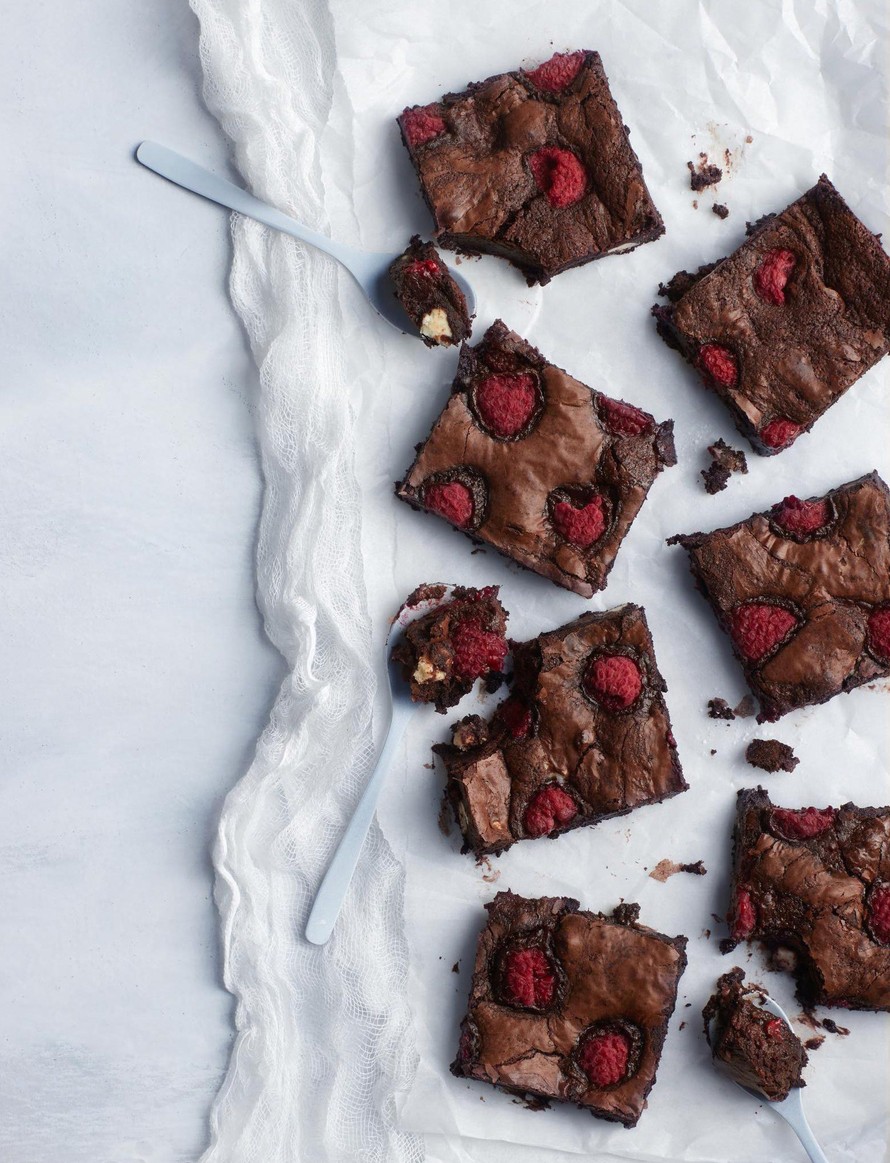 Kaada taikina vuokaan ja laita loput vadelmat päälle. Kypsennä 30 minuuttia. Browniet saavat jäädä kosteiksi.