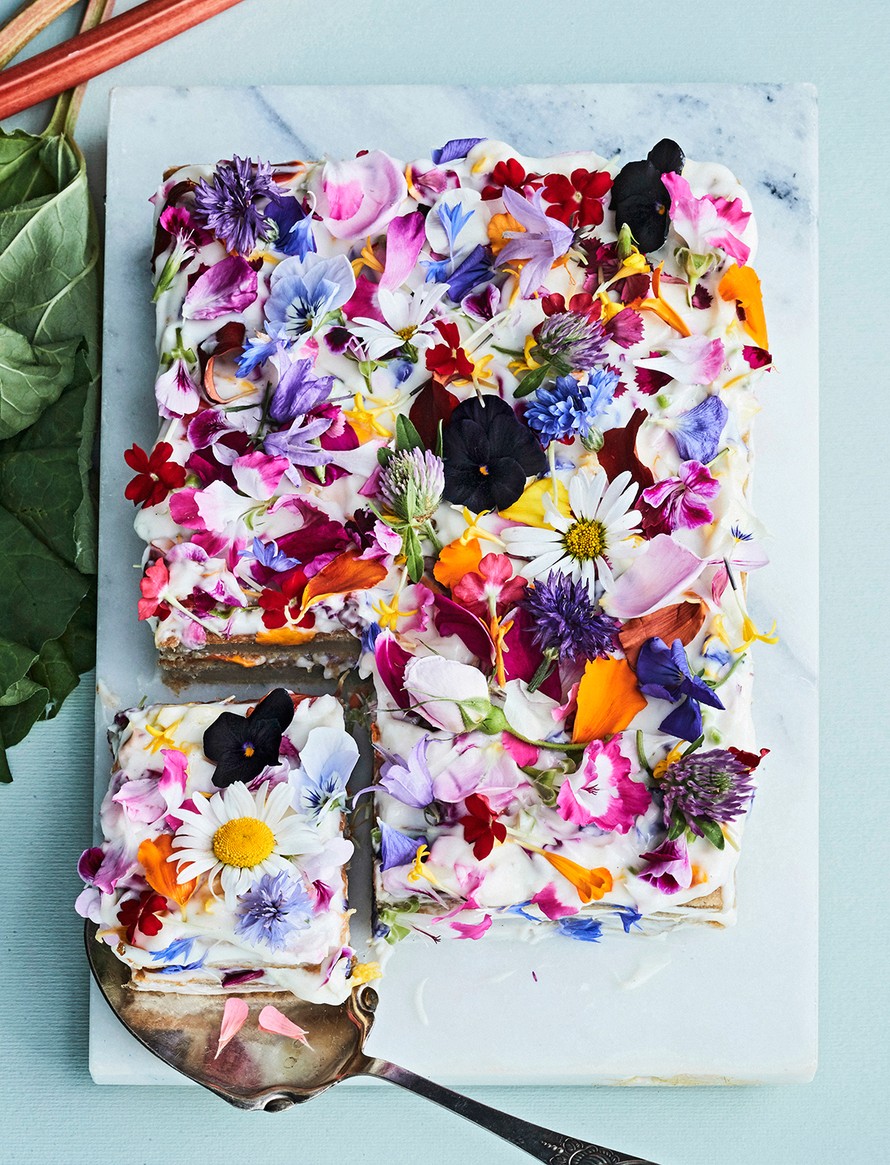 Raparperin ja ruusuveden makuinen kukkakakku saa hunnuksen koko kedollisen kukkasia.