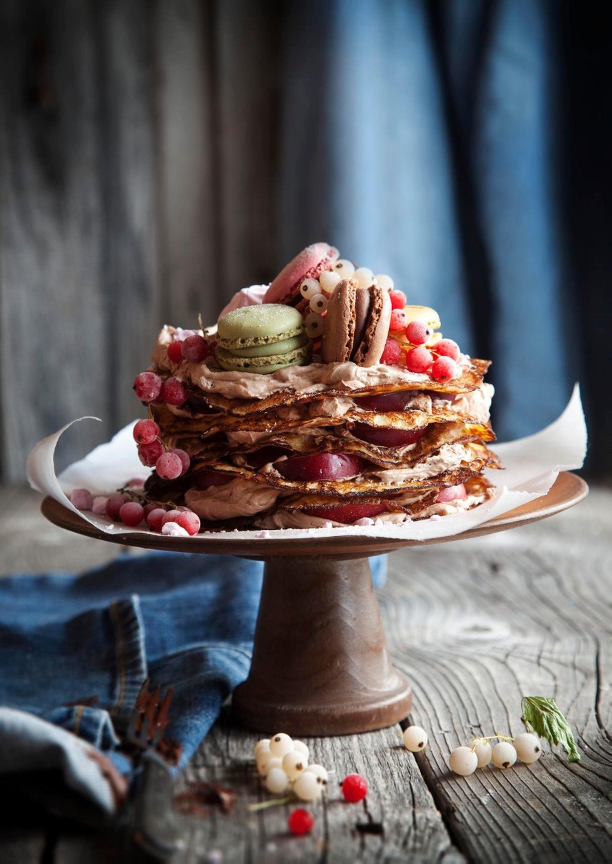 - Kokoa kakku kylmistä letuista, suklaakermasta ja hedelmälohkoista. Koristele kakku rennosti marjoilla ja macaron-leivoksilla.