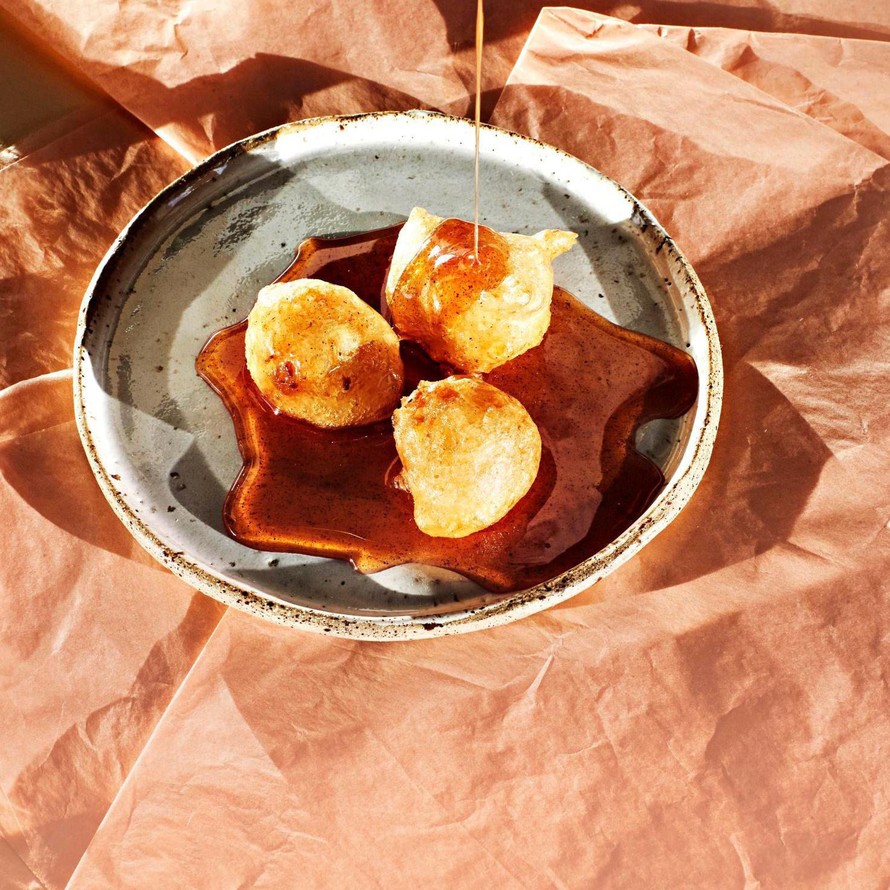 Valuta munkit talouspaperin päällä ja siirrä tarjoilulautaselle. Kaada lämmin siirappi munkkien päälle.