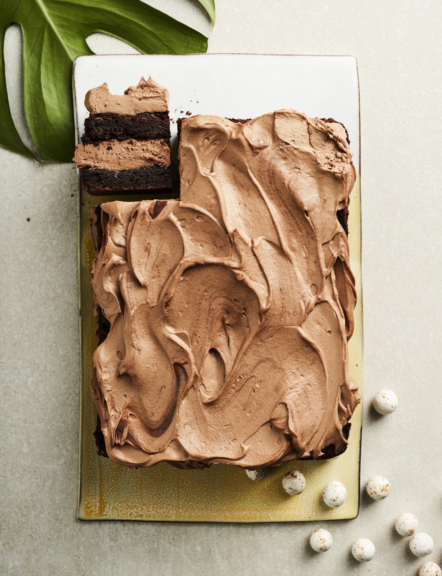 Levitä puolet mascarponevaahdosta toiselle brownien puolikkaalle. Nosta toinen puoli päälle ja koristele se lopulla suklaa-mascarponevaahdolla.