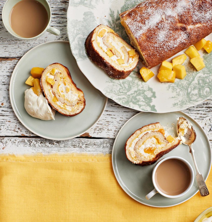 VINKKI! Voit koristella kääretorttuviipaleet kermavaahdolla ja mangopaloilla leivoksiksi.