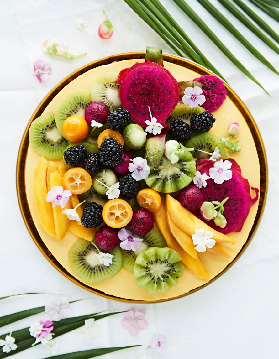 esim. kiiviä, mangoa, pitaijaa, boysenmarjoja ja syötäviä kukkia