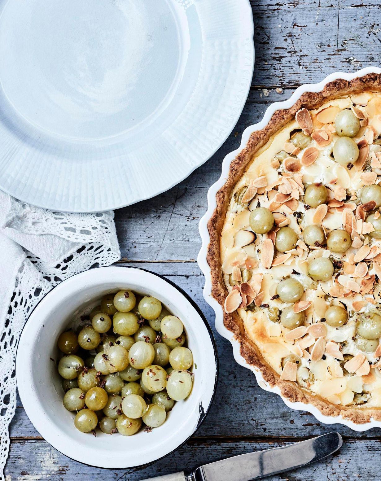 Kaada täyte taikinan päälle piirakkavuokaan. Levitä päälle karviaisia ja mantelilastuja. Kypsennä uunin keskitasolla 30 minuuttia. Anna jäähtyä ennen tarjoilua.