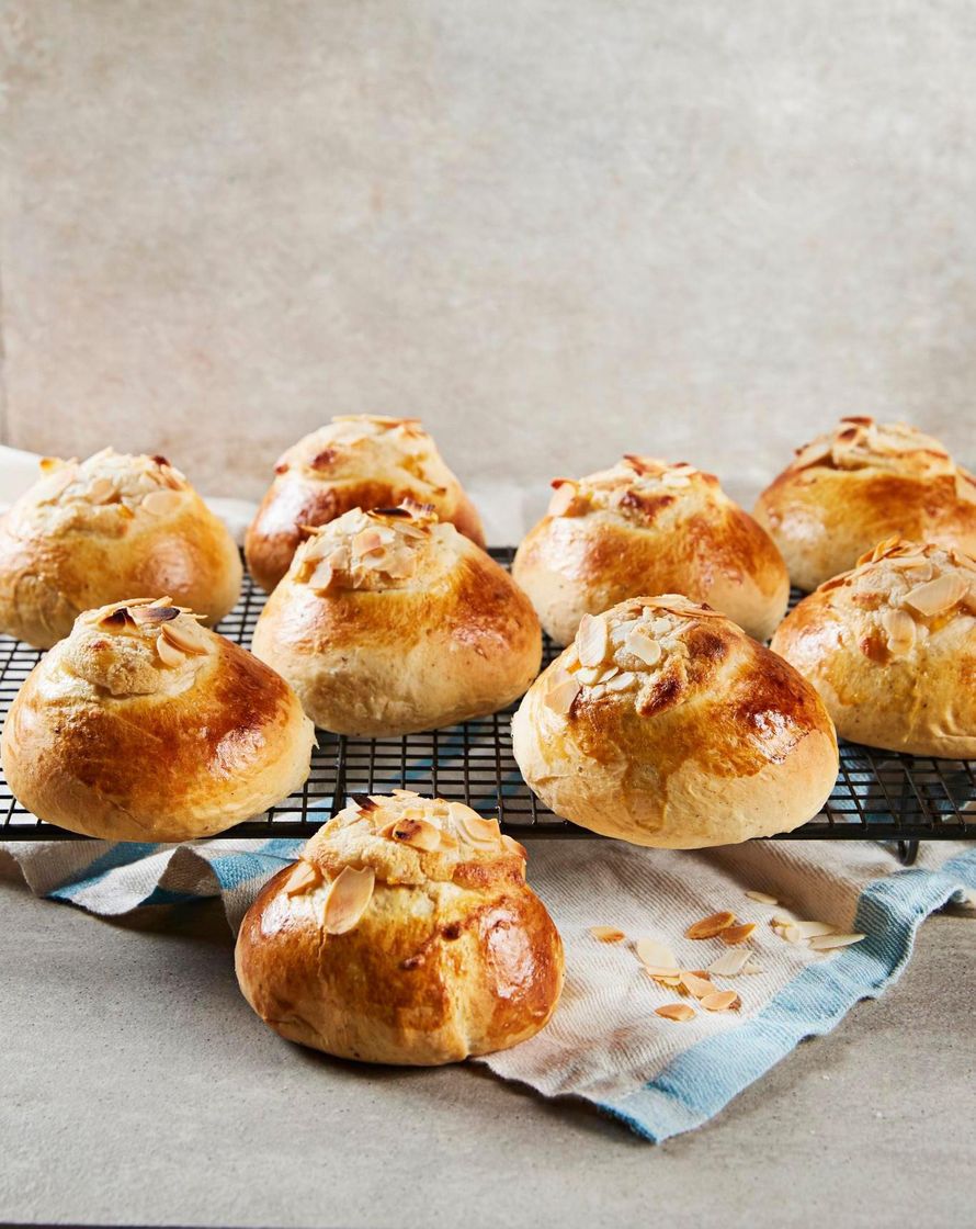 - Paina kohonneiden pullien keskelle etusormella ja peukalolla kolo. Voitele reunat munalla. Lusikoi koloon täytteeksi appelsiinimarmeladia ja notkeaa mantelimassaa. Ripottele pinnalle mantelilastuja. Paista pullia noin 10 minuuttia.