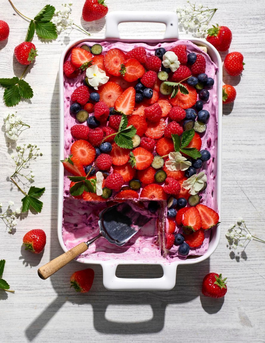 Koristeena voi käyttää marjojen lisäksi oman pihan syötäviä kasveja, kuten orvokkeja tai mansikan lehtiä.