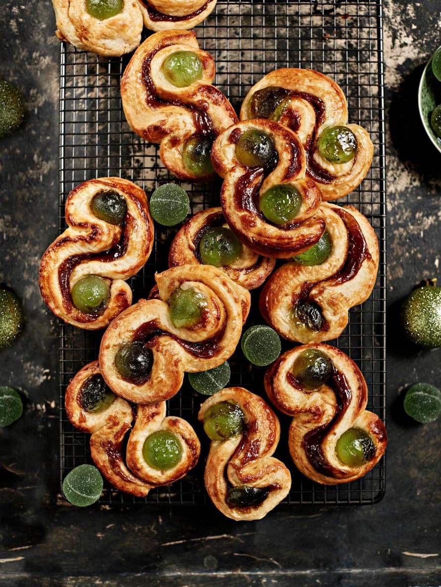 - Halkaise vihreät kuulat veitsellä. Voitele kohonneet pullat munalla. Paina kuulan puolikkaat pyöreä puoli ylöspäin syvälle kierteisiin.