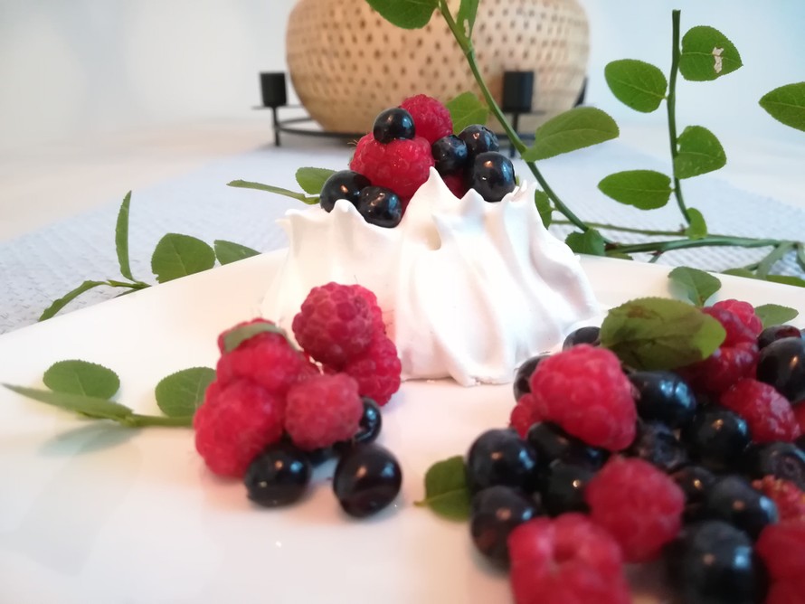 Täytä jäähtyneet marengit vaniljajäätelöllä ja metsämarjoilla.