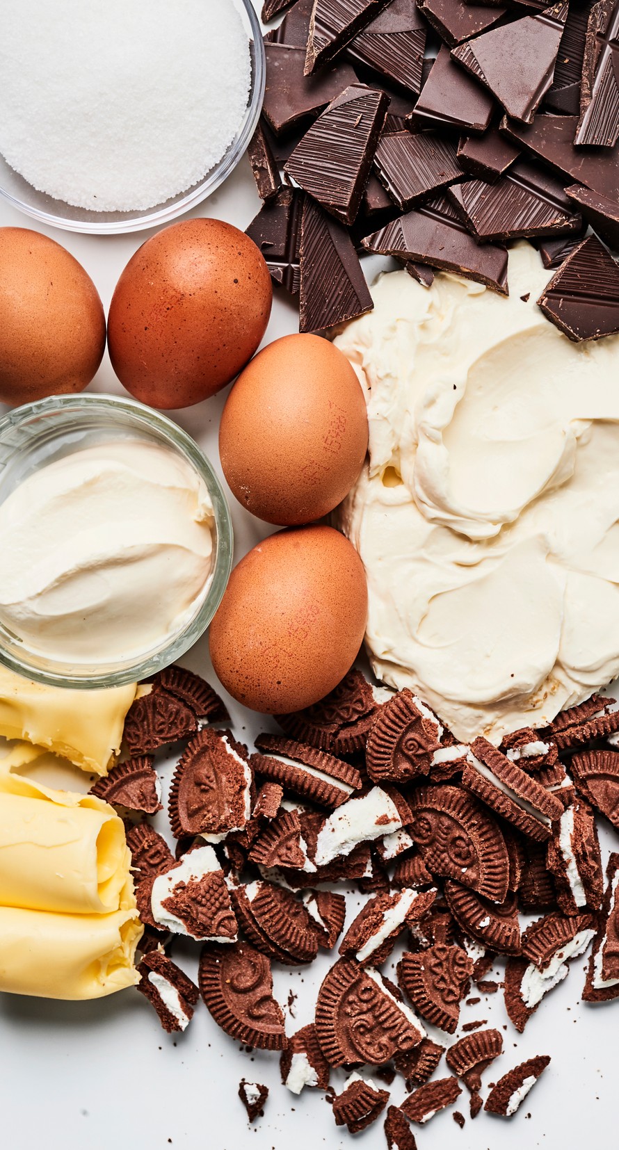 Notkista tuorejuusto kulhossa. Lisää loput aineet ja rouhittu suklaa. Lisää hieman jäähtynyt suklaa juustoseokseen ja sekoita tasaiseksi. Kaada seos vuokaan.