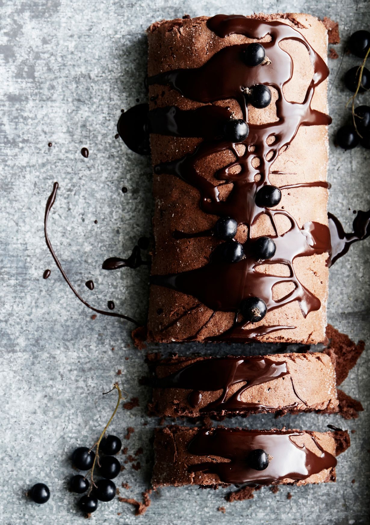 Suklaa ja mustaherukat ovat klassinen yhdistelmä. Tällä kertaa ne maistuvat tyylikkäässä kääretortussa, jonka täytteessä on kevyt inkiväärin puraisu.