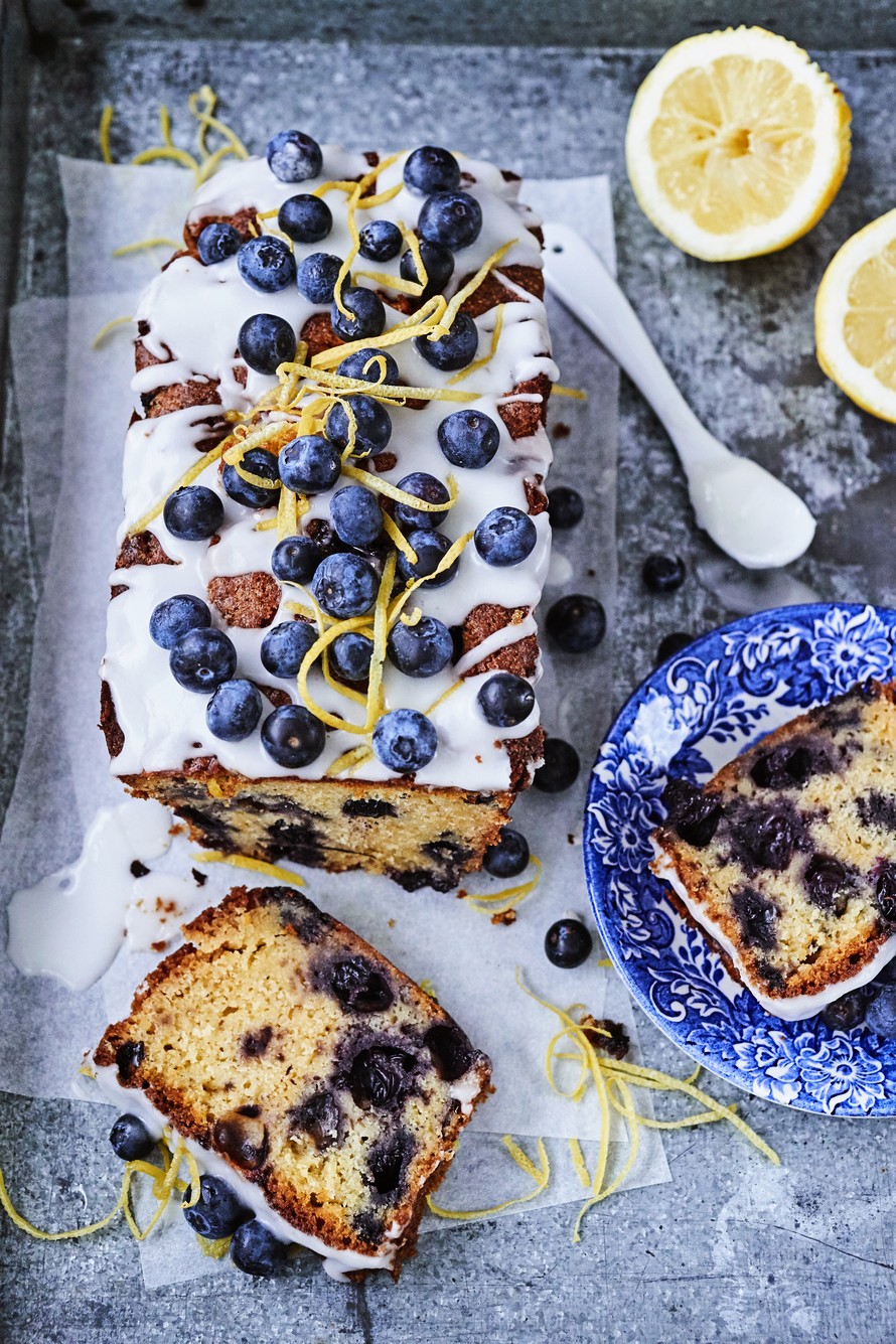 Mustikoiden täplittämä sitruunalla raikastettu kakku on ihanan mehevä ja täydellistä tarjottavaa loppukesän vieraille.
