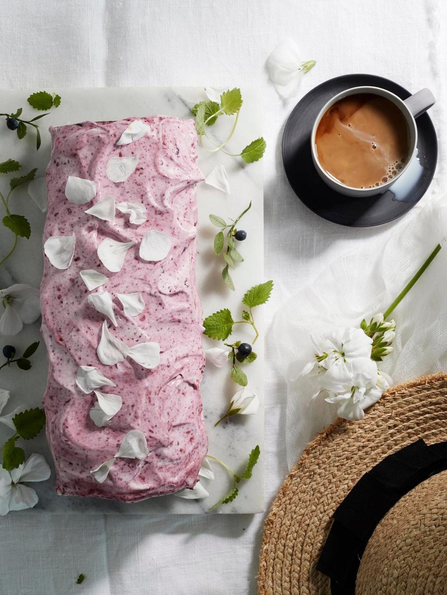 Loppu täyte muodostuu kuohkeaksi vatkatusta ranskankermasta, joka tuo sitruunamelissan lisäksi rullaan raikasta ja hieman hapanta makua. Kaunis violetti kuorrute syntyy värjäämällä osa ranskankermasta mustikkasoseella.