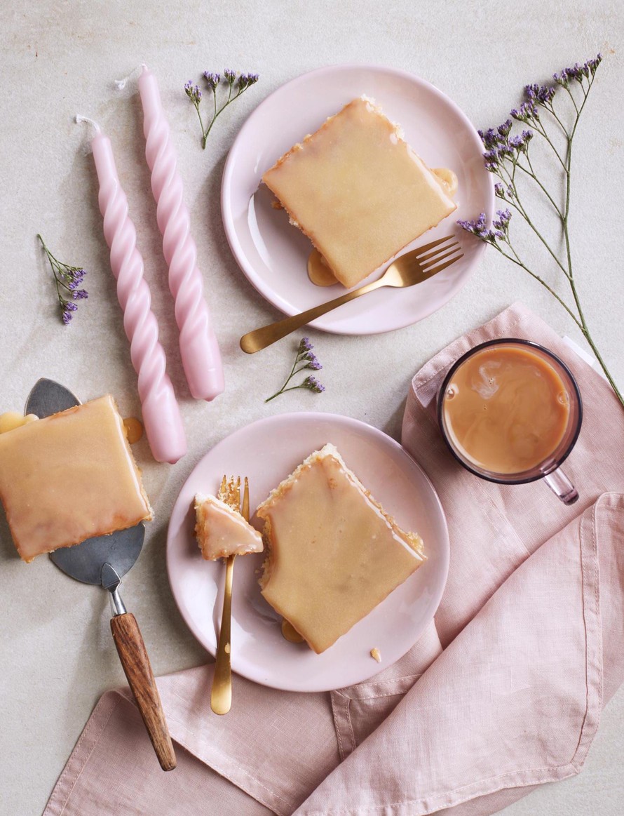 Vaalea, kuohkea pohja ja kermainen toffeekuorrutus muodostavat vaaleita mokkapaloja muistuttavan superherkun.
