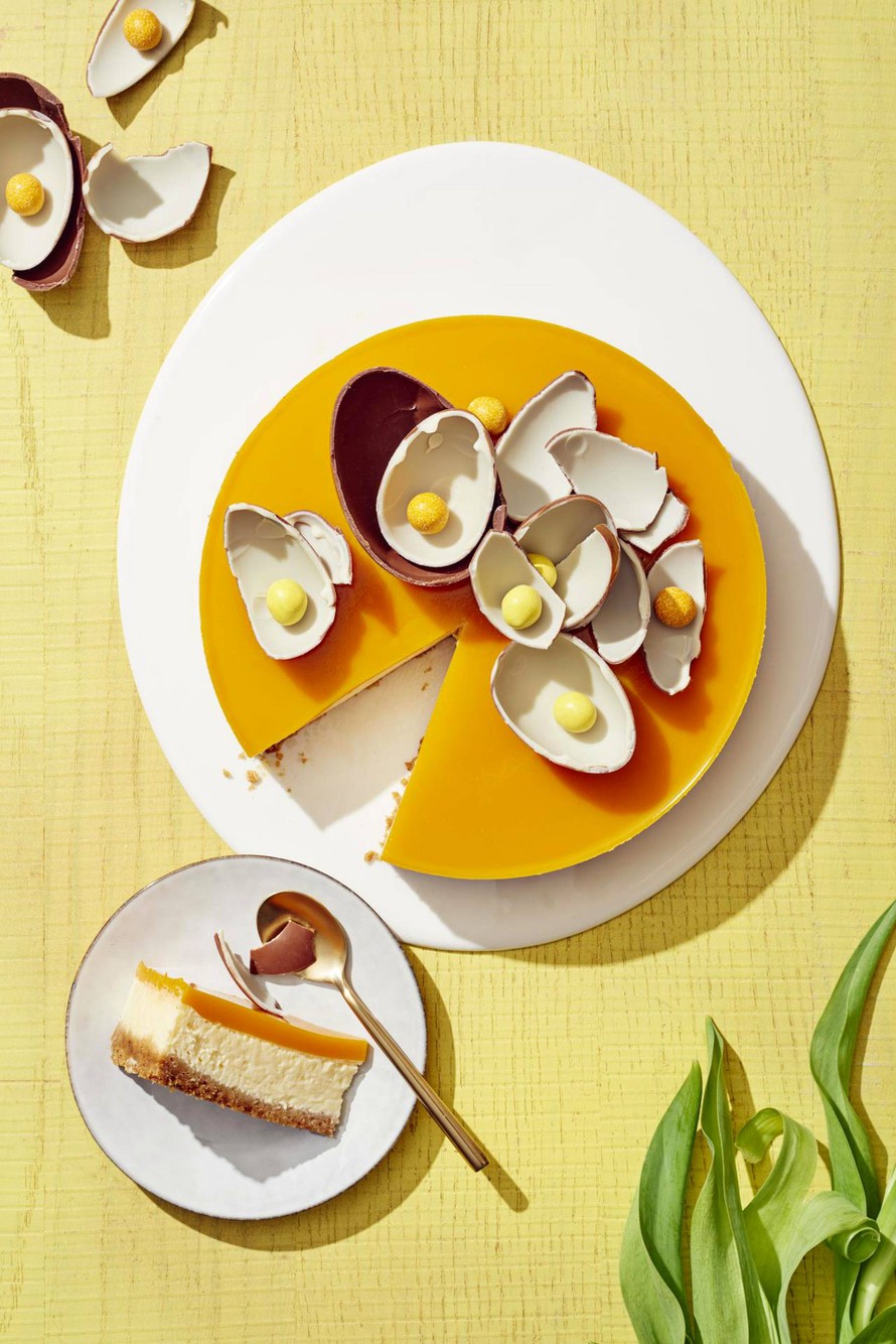 - Nosta juustokakku varovasti tarjoiluastialle ja koristele se suklaamunan puolikkailla asettamalla niitä limittäin toistensa päälle.
