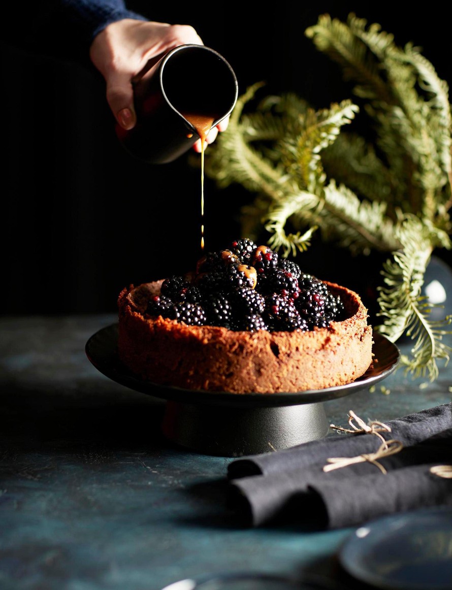 Kaada täyte kakkuvuokaan piparipohjan päälle. Jatka paistamista noin 40 minuuttia. Anna kakun jäähtyä kunnolla ennen tarjoamista, mielellään seuraavaan päivään. Koristele boysenmarjoilla.